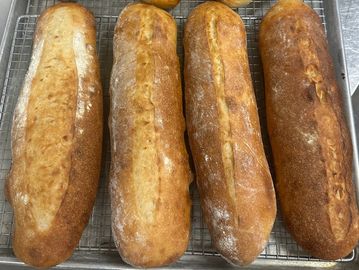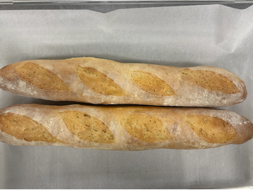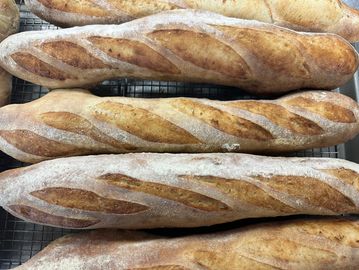 “This traditional French-style baguette carries a gentle lactic tang that mingles with warm, nutty wheat notes. Its crust has a satisfying, golden crackle, giving way to a light, open crumb that feels almost cloudlike inside.”