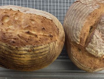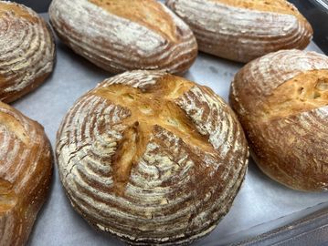 “A hand-shaped, slow-fermented loaf with a deep golden crust and a tender, open crumb. Its flavor balances subtle tang with the natural sweetness of wheat, making it a timeless bread for any table.”