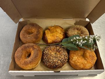 Our artisan bagels are hand-rolled, gently boiled in Jimberg maple water, and baked to golden perfection — cloudy inside, crisp outside. Made in small batches with choices of flavors. Simple ingredients and plenty of love.(contains EGGS)